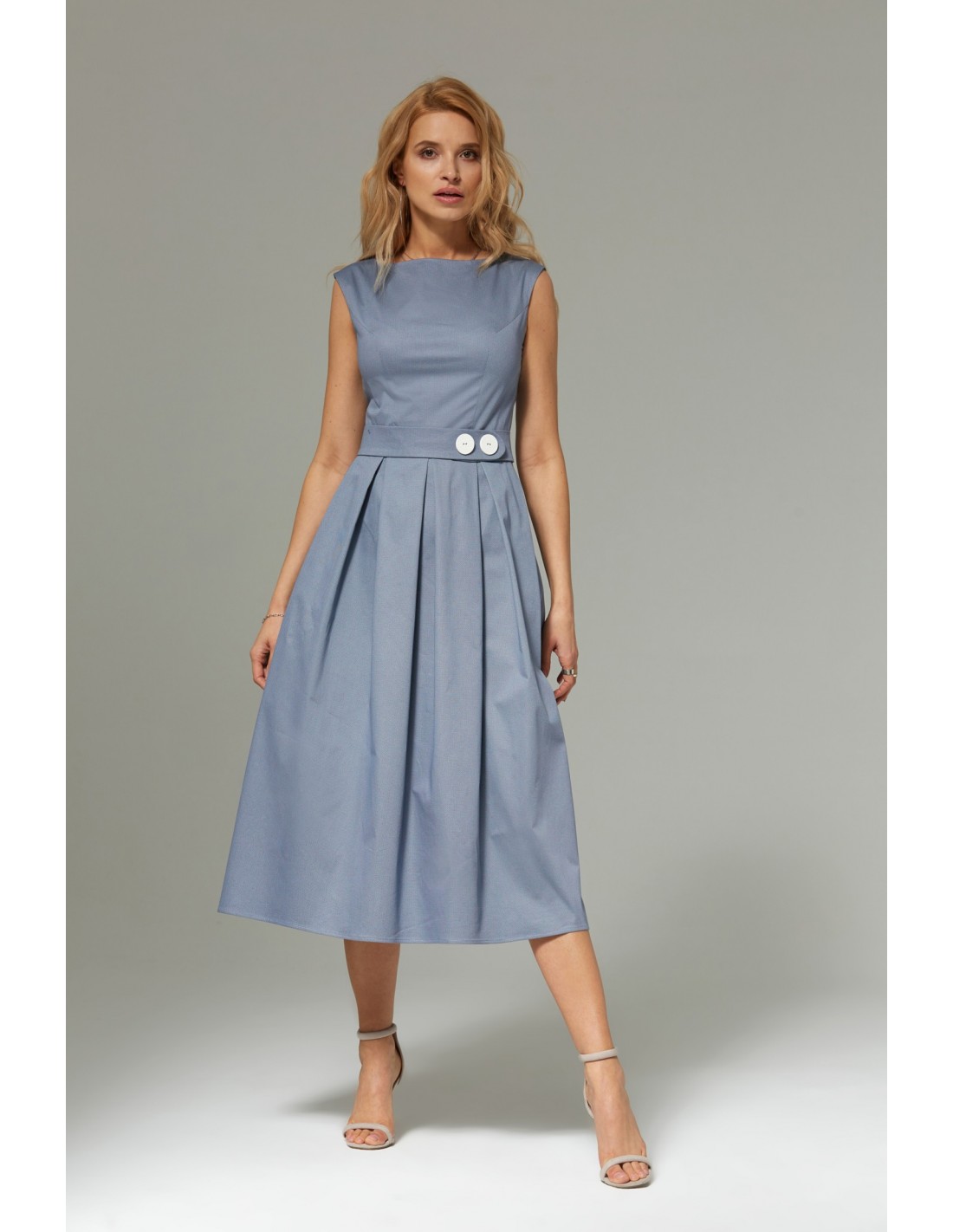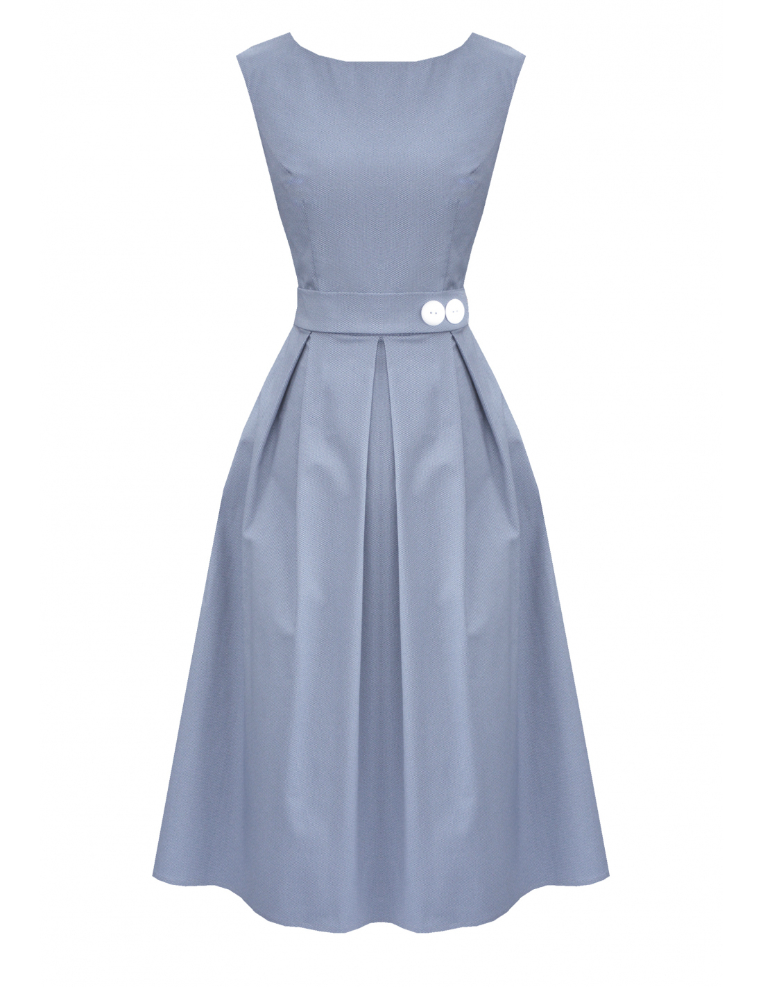 Dress made of Italian cotton satin with blue lycra. Decorative white buttons and white ankle zipper, referring to the '70s. Side seam pockets. Length from the waist about 80cm. Cotton 98%, lycra 2%. Hand wash