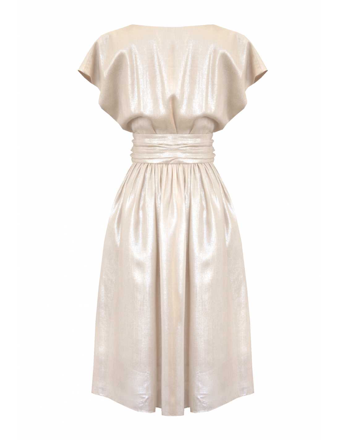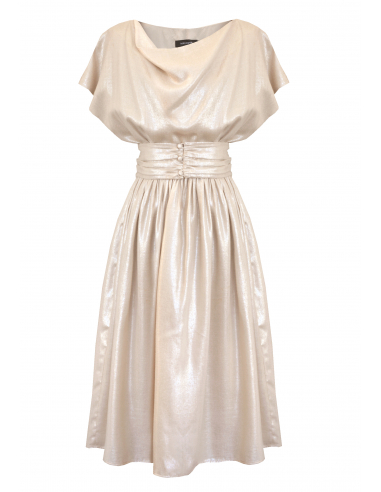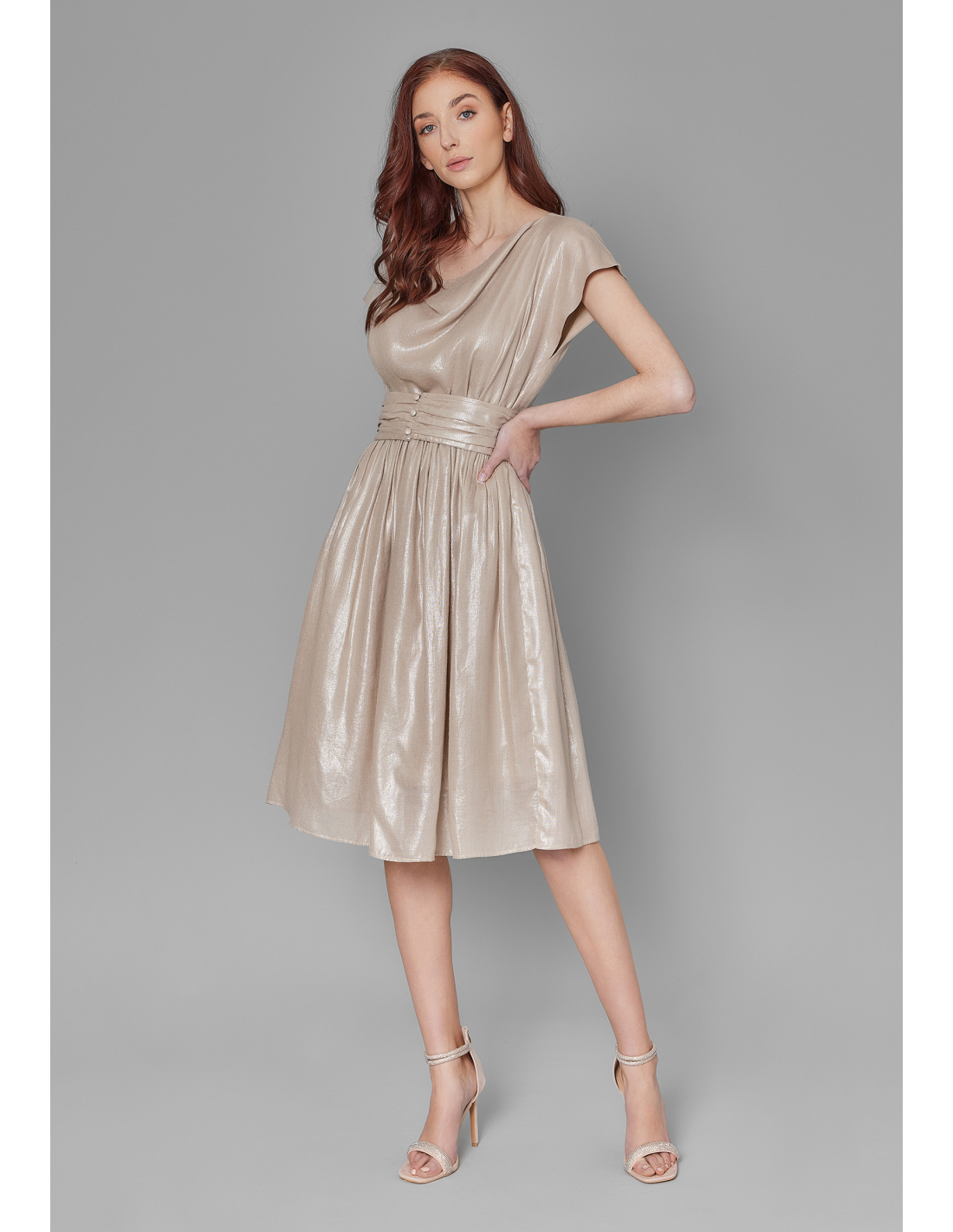 W komplecie szeroki marszczony pas zapinany na oblekane tkaniną guziczki
