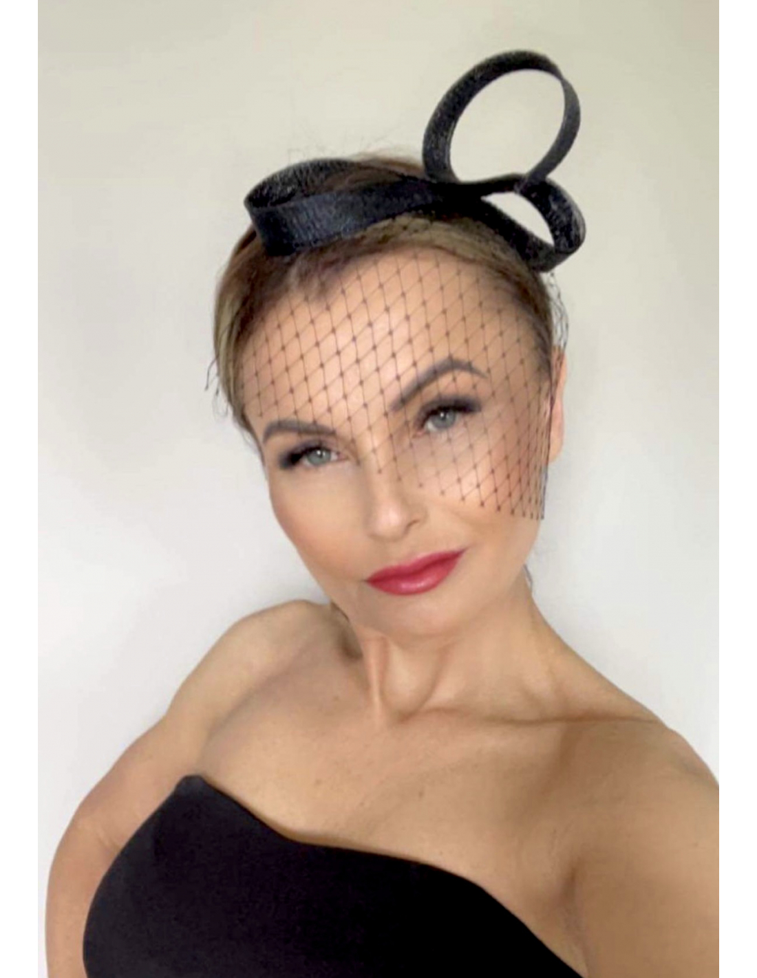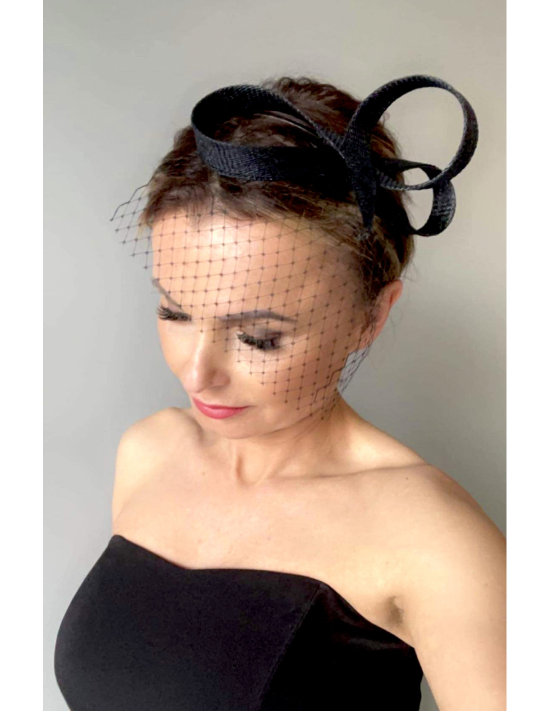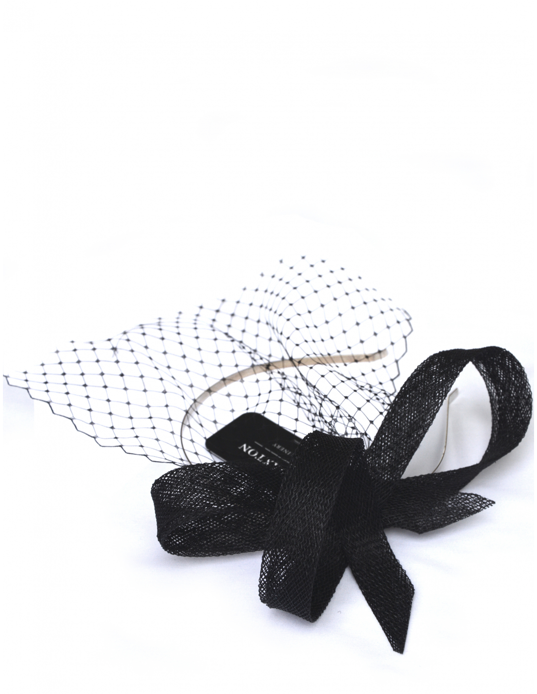 Fascynator z wąskiej taśmy sinamay, ozdobiony efektownym woalem.